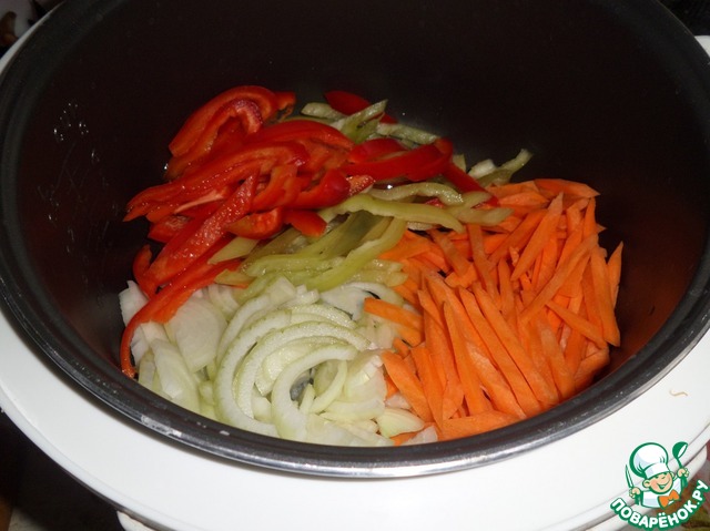 В чашу мультиварки наливаем растительное масло. Выкладываем лук, морковь и болгарский перец.