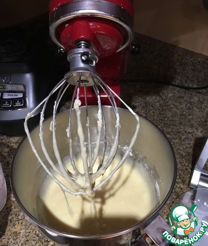 Взбиваем яйца с сахаром. Добавляем кефир, растопленное масло и муку, смешанную с пекарским порошком. Тесто получается довольно жидким. Этого не стоит бояться