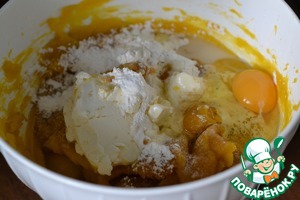 К охлажденному тыквенному пюре добавить сахар, яйцо, сыр и пудинг. Миксуем до гладкого состояния.