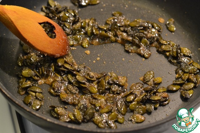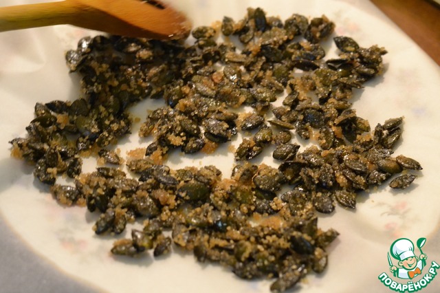 На сухой сковороде нагреть сахар, добавить семечки тыквы.
