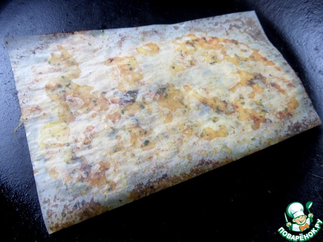 Накрыть второй половинкой листа и перенести в раскалённую сухую сковороду. Слегка прижать. Жарим около 5 минут, так как начинка будет ещё запекаться.