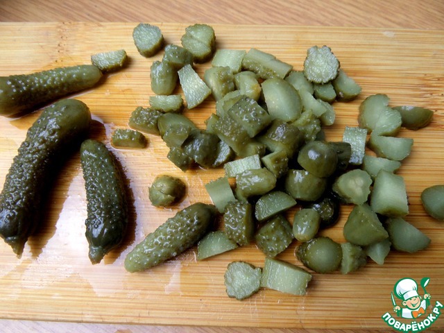 Мелкие маринованные огурчики нарезать.