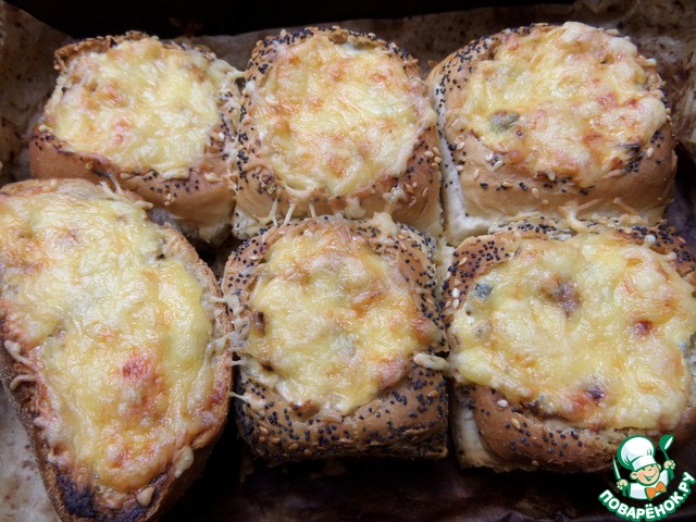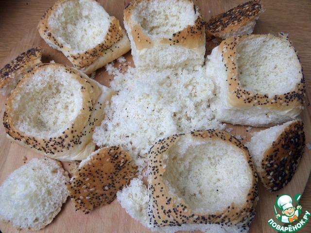 Срезать с булок крышечки, вынуть мякиш. Из горбушки тоже.