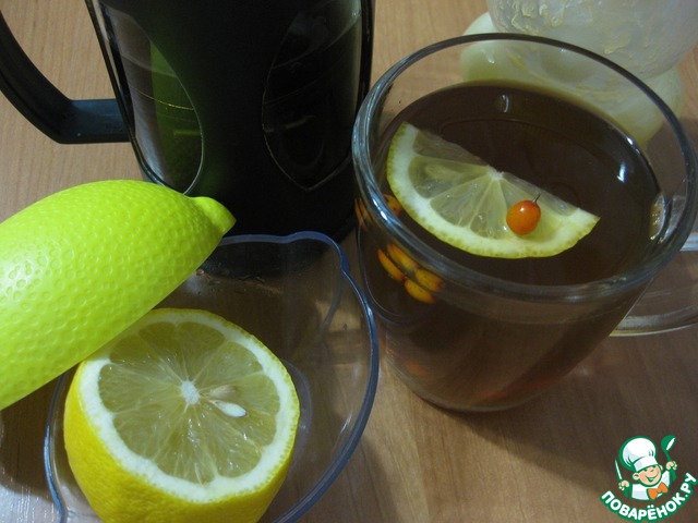 У меня облепиха замороженная, мята сухая, гвоздики положила 4шт (в следующий раз все же все 6 положу)), и дольку лимону добавила уже в кружку.