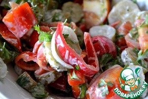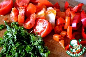 В салат добавляем порезанные помидоры, сладкий перец и зелень по вкусу.