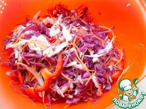 В большой миске смешать вместе оба вида капусты, сладкий перец, натертую на корейской или обычной терке морковь. Добавить заправку. Все тщательно перемешать.