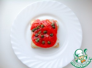 Нижний ломтик хлеба смазать соусом, затем выложить ломтики куриной грудки, затем помидоры и каперсы.