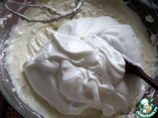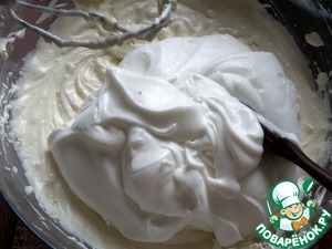 Затем добавить тонкой струйкой распущенный желатин, хорошо перемешать лопаткой. Осторожно подмешать взбитые сливки, стараясь сохранить воздушность.