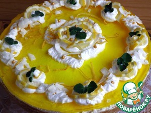 Готовый торт украсить сливками, кокосовыми чипсами и дольками лимона. Подавать охлажденным.