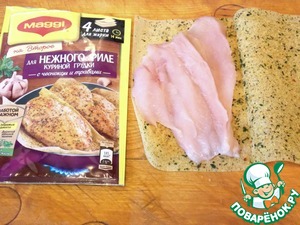 Для этого салата нам нужно сначала приготовить куриную грудку. Для этого мы берем куриную грудку и надрезаем ее ее вдоль, чтобы получился тонкий пласт. Берем лист с приправами от ТМ "Магги" и укладываем на одну половину листа, а другой накрываем и прижимаем ладонью.