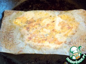 Нагреть чистую сковородку и положить на нее наше филе в бумаге. Обжаривать на медленном огне с двух сторон по 3-4 мин. до готовности. Снять со сковороды и, не раскрывая, дать остыть, чтобы весь сок остался внутри грудки.