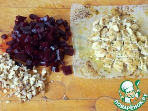 Свеклу нарезать мелким кубиком. Орехи измельчить на кусочки. Чеснок натереть. Остывшую грудку порезать средним кубиком.