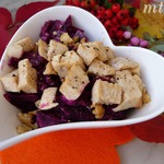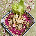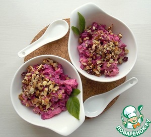 В чашу сложить куриную грудку, свеклу, чеснок и йогурт, перемешать. Положить в порционные тарелки и посыпать рубленными орехами.