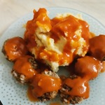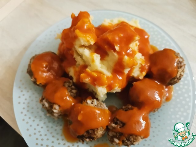 В итоге выходит вот такая прелесть. Как сфотографировать его я не придумал, ну что б была видна консистенция и все такое, по сему взял на гарнир картошечку пюре. Ибо в ней соус не теряется как допустим в рисе и гречке и положил фрикаделек.