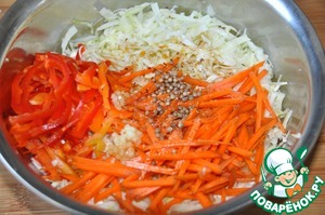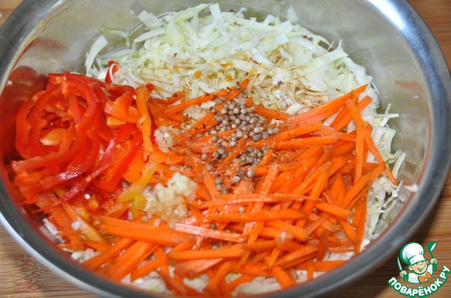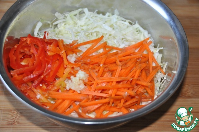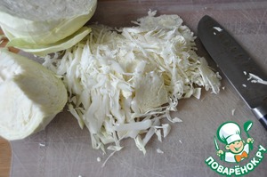 Берём капусту поздних сортов и режем тонко соломкой. Слегка перетираем с солью. Не пересолите!