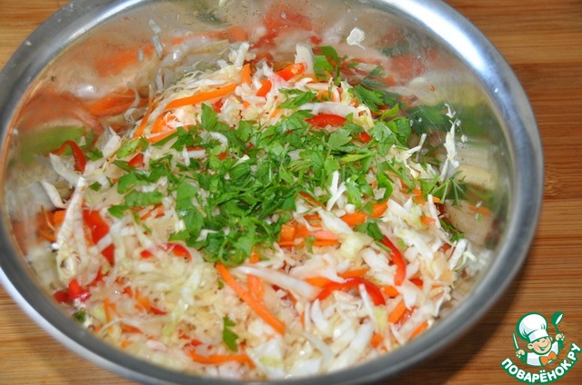 Кладём мелкорубленную зелень петрушки или кинзы, что более предпочитаете. Перемешиваем, ставим в холодное место на сутки мариноваться. Хотя, эта капуста чем дольше стоит, тем вкуснее, так как начинается процесс брожения, начинает подкисать.