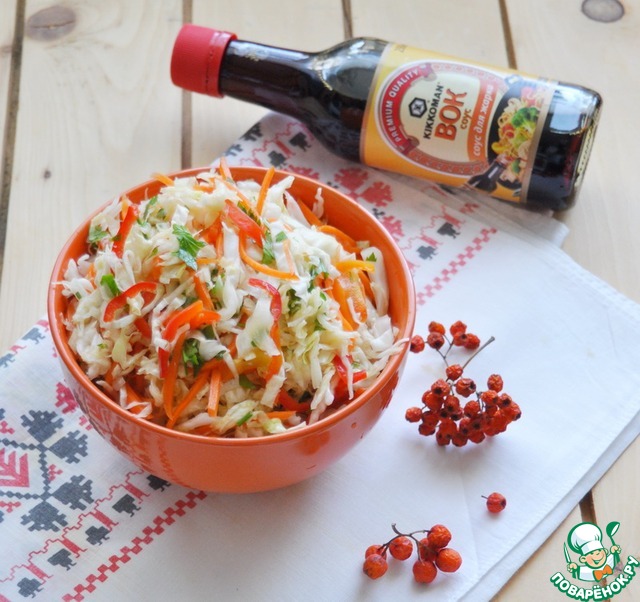 Этот рецепт знаю более 30 лет, ему научил меня сосед, когда жили в Ош (Кыргызстан). Сосед был прапорщик, украинец. Тогда, конечно, не добавляли соевый соус, это уже сейчас я стала вносить свои коррективы по вкусу. Делала этой капусты обычно ведро и хранила зимой на веранде. Даже в борщ понемногу добавляла, был очень пикантный вкус, всем нравился.
