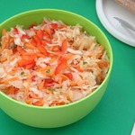 Капуста получилась очень вкусная. Кориандр придает особую нотку. Больше похоже на вкусный салат, а не на привычную квашеную капусту. Зелень не добавляла, побоялась, что она испортится, если сразу не съедим. Подскажите, а у Вас всю зиму стояла приготовленная с зеленью?