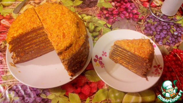 По исходному количествуву продуктов - получается 8-9 блинов. У меня моркови и лука оставалось чуть-чуть - поэтому тортик маленький - из 5 блинчиков.