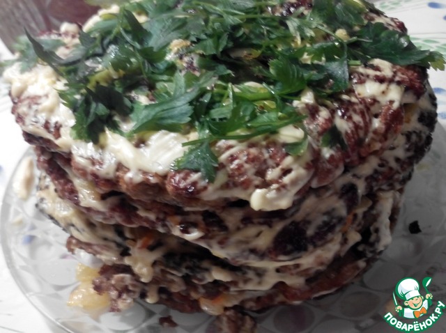 Скажу честно - печенку я не люблю, но была в гостях и попробовала там этот тортик. Взяла рецепт и приготовила дома, а потом еще... На сайте не искала, может, и есть такой вариант приготовления. Так что сразу извиняюсь. Если нет - предлагаю заглянуть, вдруг кому-то пригодится...