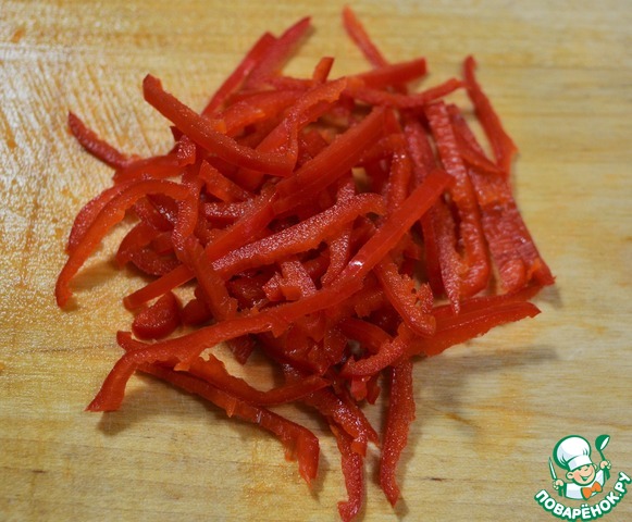 Перец болгарский нарезать тонкой соломкой и обжрарить с луком.