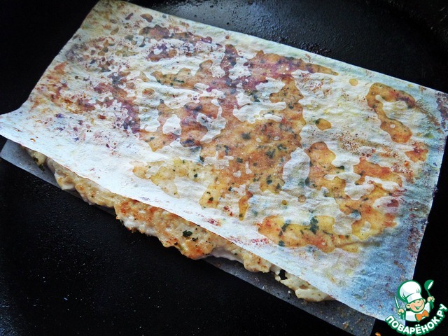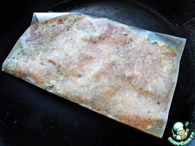 Накрываем второй половинкой листа и переносим на раскалённую сухую сковороду. Слегка прижимаем. Огонь убавить.