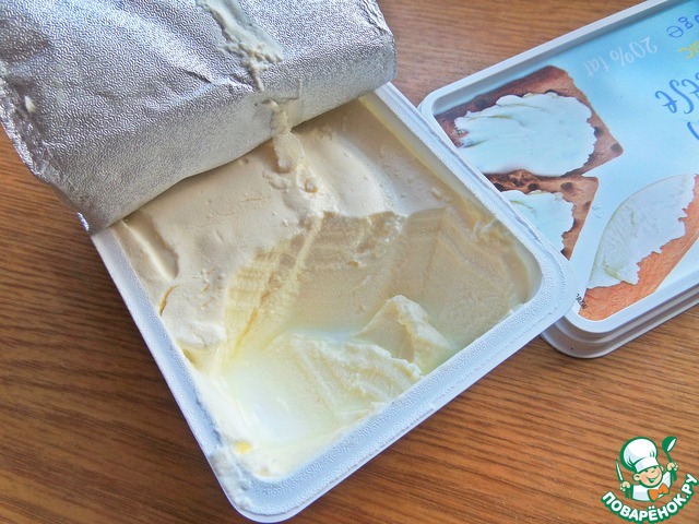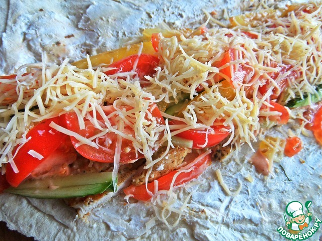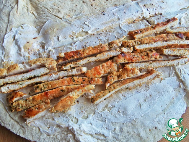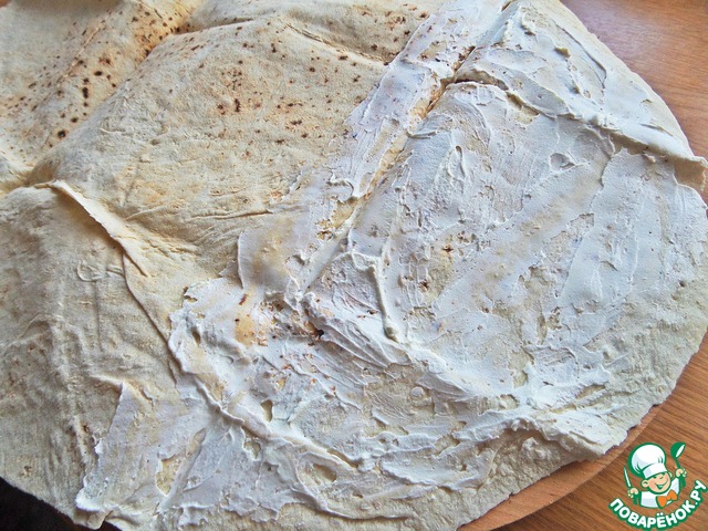 Раскрыть тонкий лаваш и смазать половину сыром.