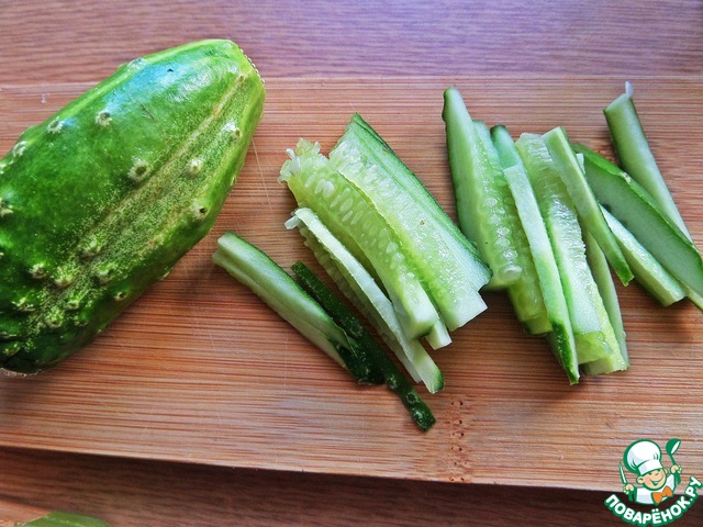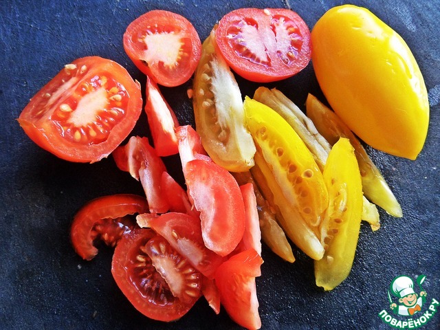 Помидоры у меня мелкие, разные, но достаточно одного среднего. Нарезать дольками.