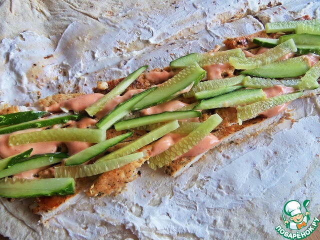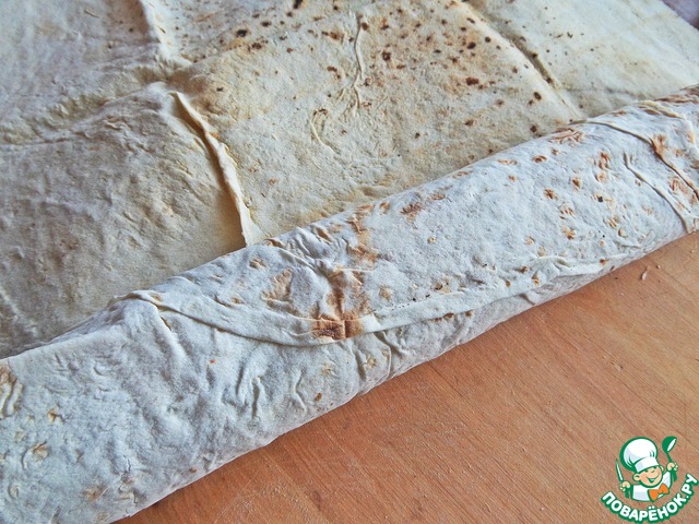 Свернуть в рулет. Для шва промазать водой полоску и отрезать лишнюю половину лаваша.