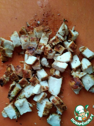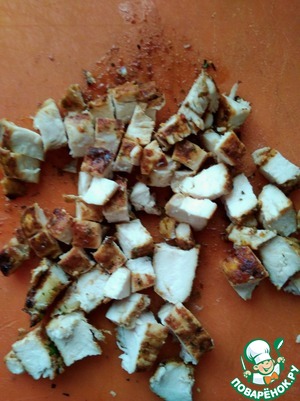 Обжаренное куриное филе нарезать произвольными кубиками.
