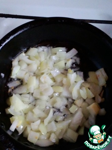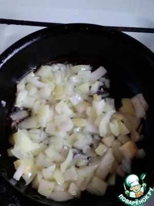 Лук нарезать произвольно и пережарить на разогретой сковороде с растительным маслом 2 минуты.