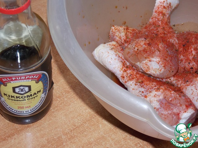 • Куриные голени помыть, обсушить. Выложить в миску, добавить аджику сухую, соль и перец по вкусу. Влить соевый соус и растительное масло.