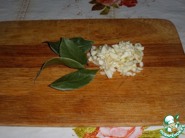 • Добавляем в кастрюлю чеснок и лавровый лист. Аккуратно перемешиваем с помощью ложки. Варим 1 минуту и убираем кастрюлю с огня. Накрываем кастрюлю крышкой и оставляем на 5-7 минут.