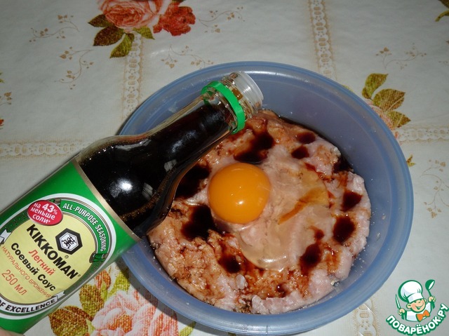 • В чашку к фаршу добавляю яйцо и соевый соус.