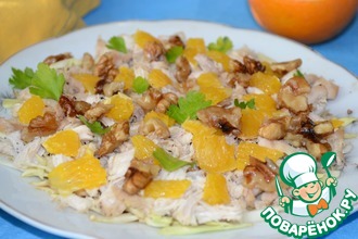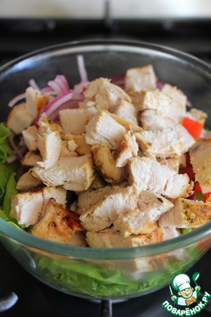 Остывшую грудку нарезать кубиком, добавить к салату, перемешать.