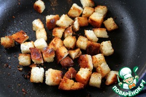 Батон нарезать кубиком, сбрызнуть растительным маслом и обжарить на сковороде до золотистого цвета.