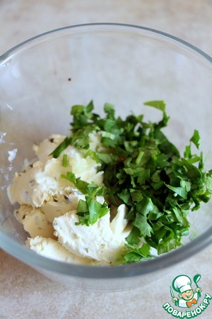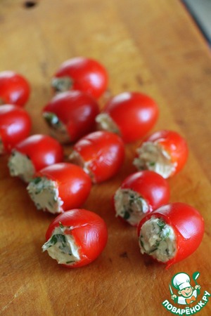 Для фарширования черри смешать творожный сыр с нарезанной кинзой и измельченным 1 зубчиком чеснока.