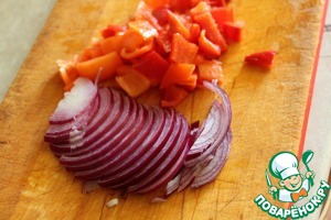 Нарезать болгарский перец кубиком, красный лук- полукольцами.