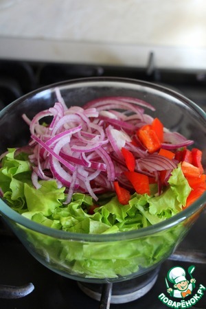 В чашку нарвать листья салата, добавить перец и лук.