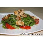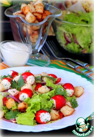 На тарелку выложить салат, посыпать сухариками, сверху украсить фаршированными черри. Подавать с чесночным соусом.