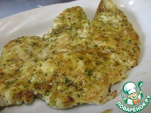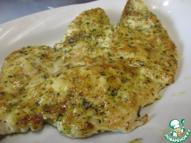 • Мясо пожарилось, получился тонкий ломтик куриного филе, сочный и пропахший приправами