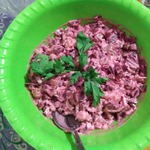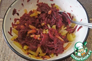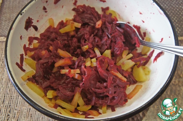 Свеклу натереть на крупной терке и отжать лишний сок, который следует обязательно выпить! Очень полезно! Огурец нарезать крупной соломкой, смешать со свеклой.