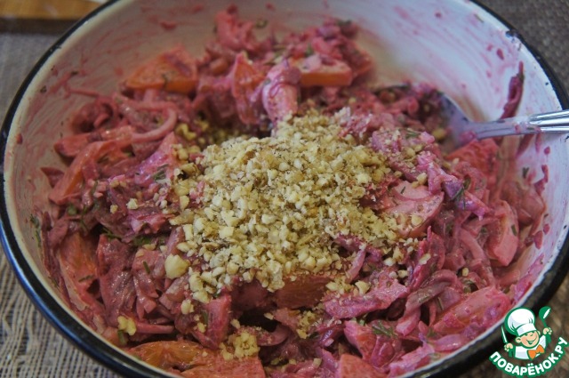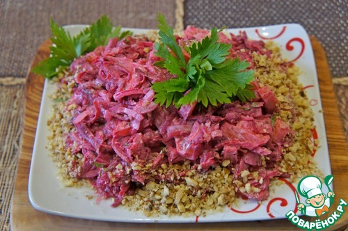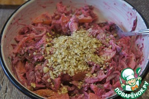 Все смешать, добавить дробленые орехи, заправить майонезом и молотым кориандром.