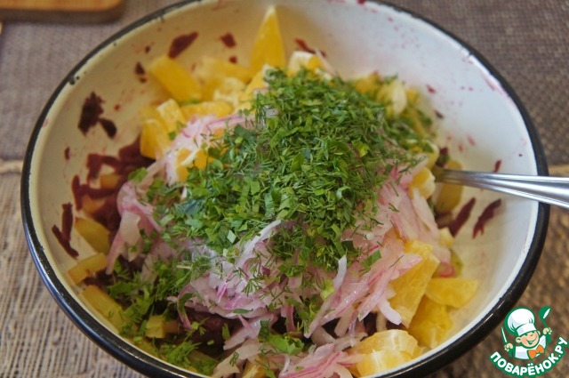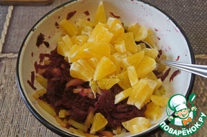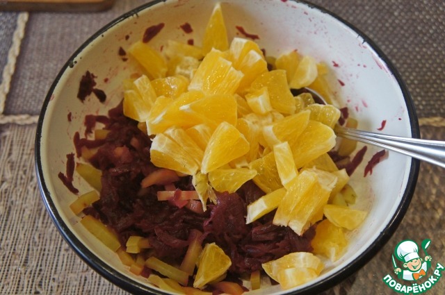 Апельсин разделить на дольки и нарезать поперек ломтиками. Добавить к салату.