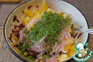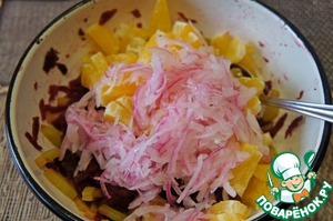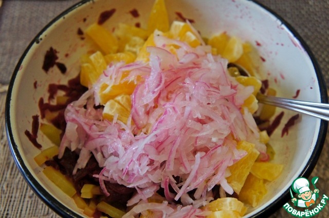 Лук тонко нашинковать и замариновать на 15 минут в воде с добавлением сахарного песка и уксуса, затем отжать от маринада.