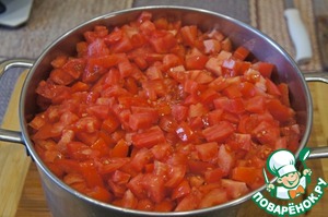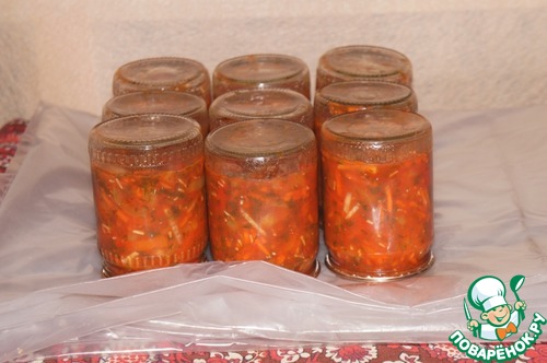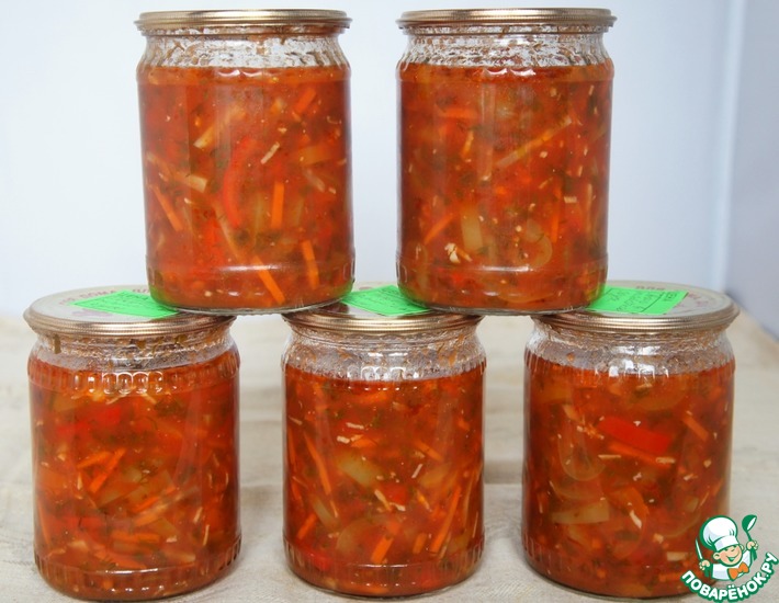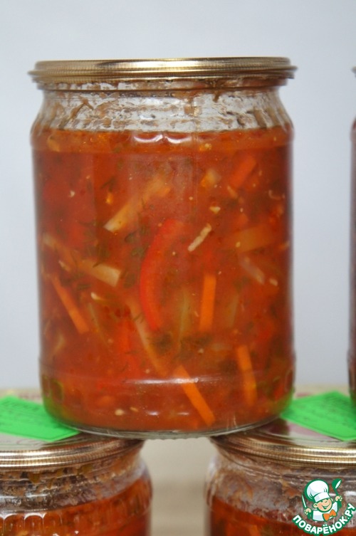 Очень вкусная заготовка. То ли салат, то ли соус... едим в качестве закуски, тушу с ним мясо или курицу, а также с успехом использую в качестве соуса на пицце.