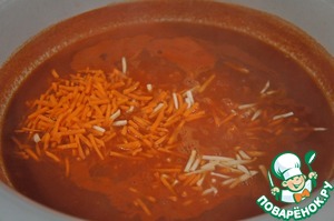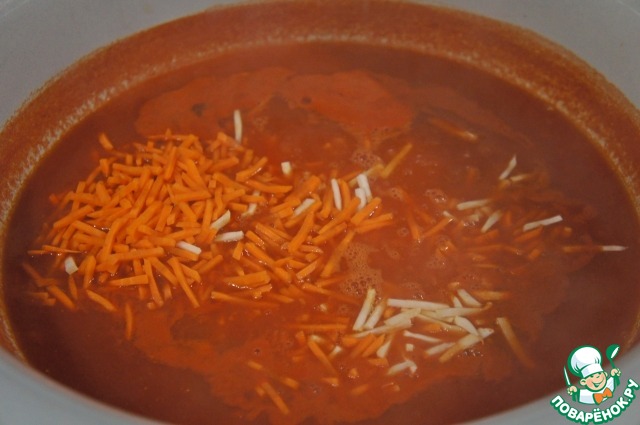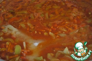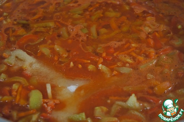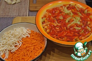 Пока варится сок, нашинковать соломкой морковь и сельдерей. Нарезать широкой лапшой перец.