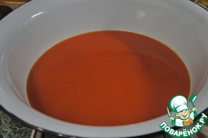 Итак, на дно большого таза налить масло, затем вылить томатный сок.