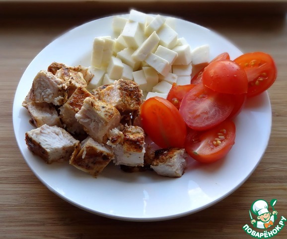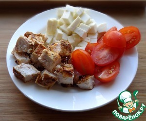 Нарезать сыр и филе кубиками со стороной примерно 1*1 см. Если черри совсем маленькие, можно их оставить целыми, у меня черри-сливка, поэтому я их разрезала пополам.