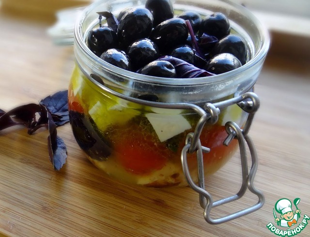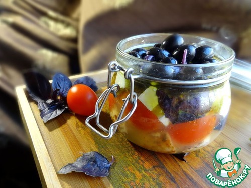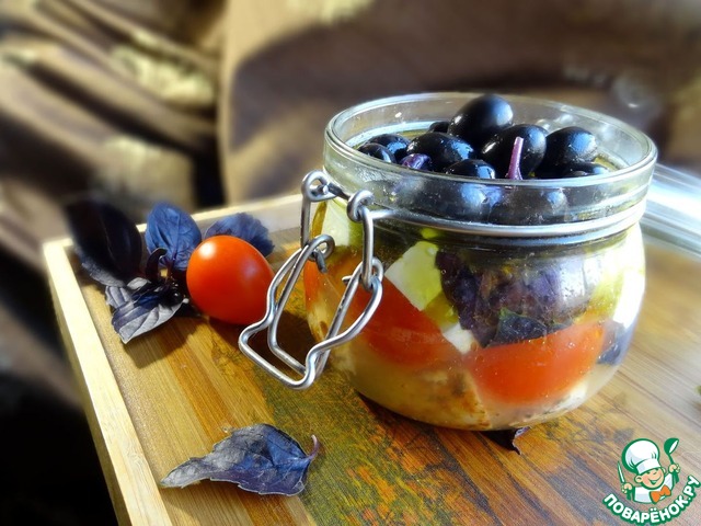 В банку слоями выложить куриное филе, черри, сыр и маслины. Между слоями положить листья базилика. Залить заправку, прикрыть баночку крышкой и слегка встряхнуть. Убрать в холодильник.